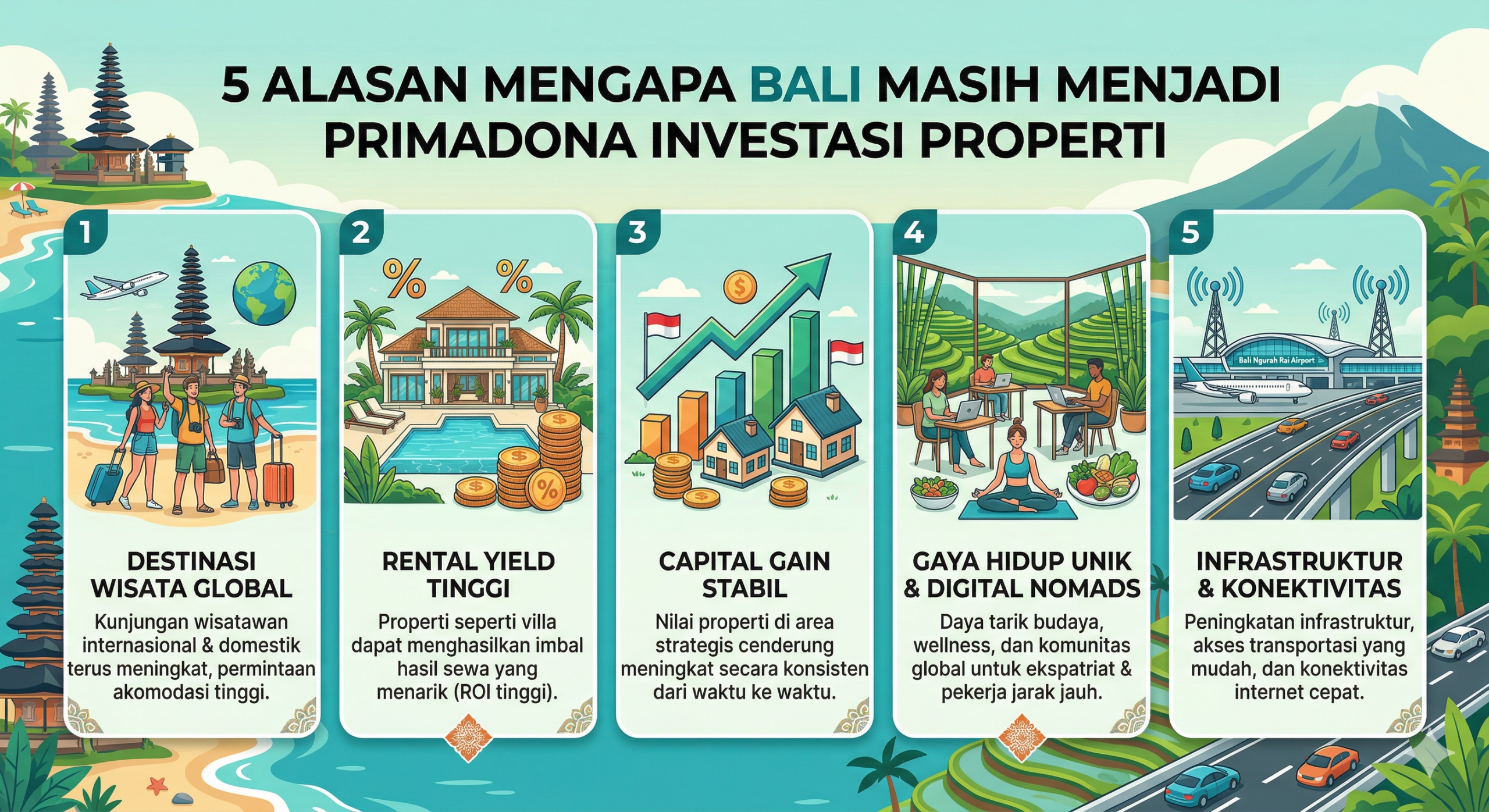 A key indicator of a healthy property market is government and private investment in local infrastructure. Bali is continuously upgrading its facilities to support its growing population, which in turn drives up property values.